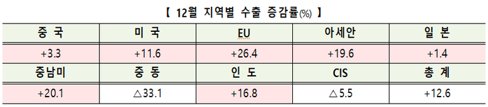 ▲ 12월 지역별 수출 증감률. [출처= 산업통상자원부] |