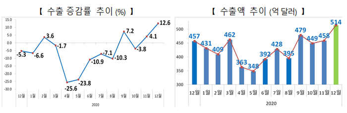 ▲ 2020년 12월 수출 증감률과 수출액 추이. [출처= 산업통상자원부] |