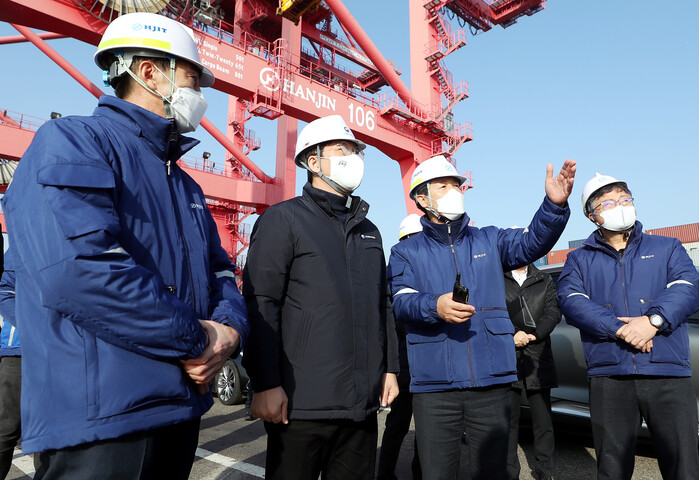 ▲ 성윤모 산업통상자원부 장관(왼쪽에서 두 번째)이 2021년 신축년(辛丑年) 첫날인 1일 오전 인천시 연수구 송도 신항 한진터미널을 방문해 수출 현장을 점검하고 있다. [인천= 연합뉴스] |