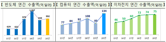 ▲ 반도체 컴퓨터 이차전지 연간 수출액. [출처= 산업통상자원부] |