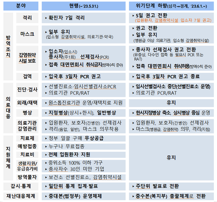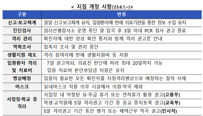 | ▲ 위기단계 하향에 따른 코로나19 대응 지침 개정 사항. [질병관리청장 제공] |