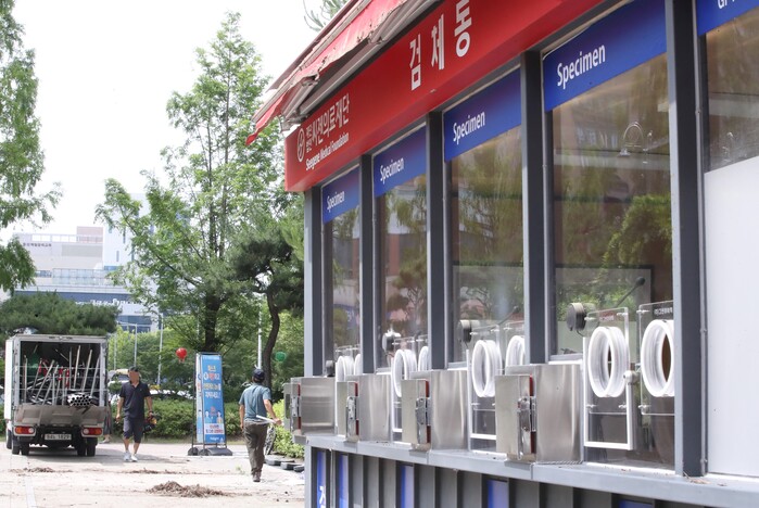 | ▲ 코로나19 위기 단계가 '심각'에서 '경계'로 하향 조정된 1일 오전 대전 시청광장 선별검사소가 철거되고 있다.. 이날부터 PCR 검사를 위한 선별진료소 운영은 유지되나 임시선별검사소 운영은 중단됐다. [대전=연합뉴스] |