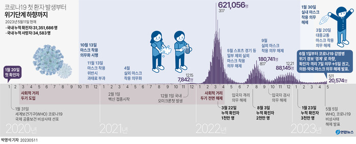 | ▲ 코로나19 국내 첫 환자 발생부터 위기단계 하향까지. [그래픽=연합뉴스] |