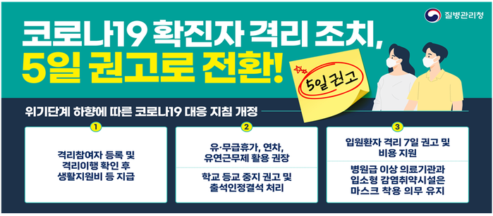 위기단계 하향에 따라 개정된 코로나19 대응 지침의 주요 내용을 보면, 1일 0시부터 코로나19 확진자에게 부과됐던 ‘7일간의 격리 의무’는 없어지고 ‘5일 격리 권고'로 바뀌었다.