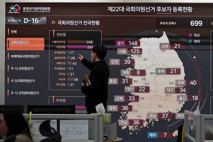 | ▲ 제22대 국회의원선거 재외투표가 27일(한국시각 오전 4시) 뉴질랜드대사관‧오클랜드총영사관 재외투표소를 시작으로 전 세계 115개국(178개 재외공관) 220개 투표소에서 내달 1일까지 실시된다. 사진은 지난 25일 오후 과천 중앙선거관리위원회의 선거종합상황실 현황판에 후보자 등록현황 등이 표시돼 있는 모습. <서울=연합뉴스> |