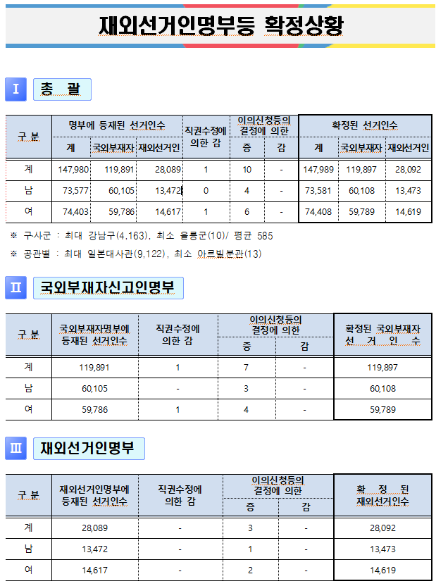 4‧10 총선 재외선거 유권자 수는 총 14만7989명(국외부재자 11만9897명‧재외선거인 2만8092명)이다.