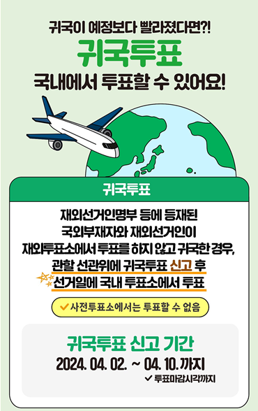 | ▲ 귀국이 예정보다 빨라졌다면 관할 선관위에 귀국투표 신고 후 선거일인 4월10일에 국내 투표소에서 투표할 수 있다. <중앙선거관리위원회 제공> |
