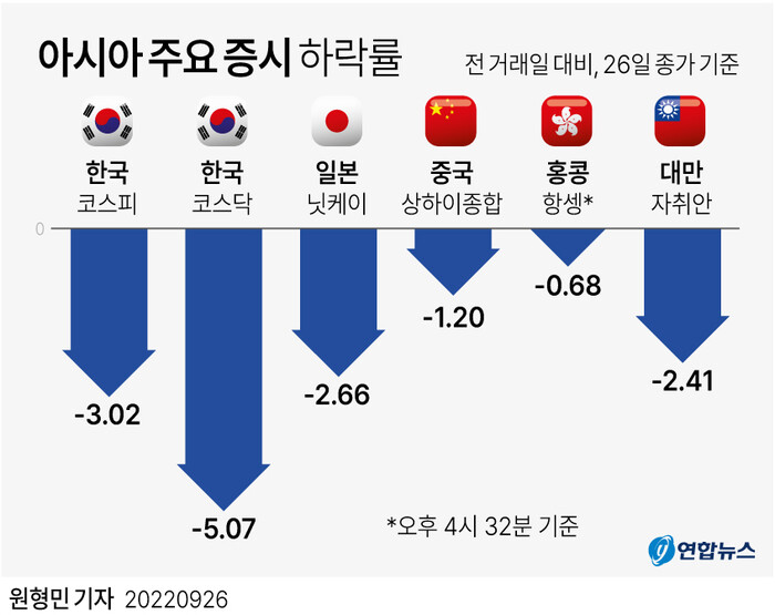 | ▲ 26일 종가 기준 전 거래일 대비 아시아 주요 증시 하락률. [그래픽=연합뉴스] |