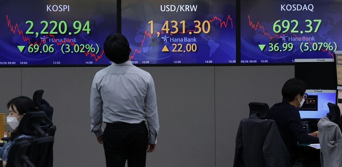 26일 코스피와 코스닥지수는 각각 3%, 5% 폭락했고 계속된 강달러에 원/달러 환율은 1430원을 돌파했다. 국고채 금리도 폭등했다.