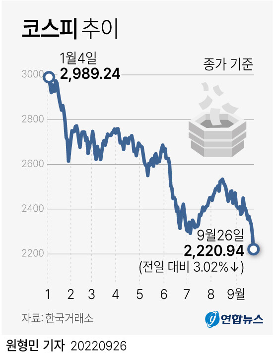 코스피 2220.94 "2년 2개월만에 최저:…환율 1430원 "13년6개월 만에 최고"