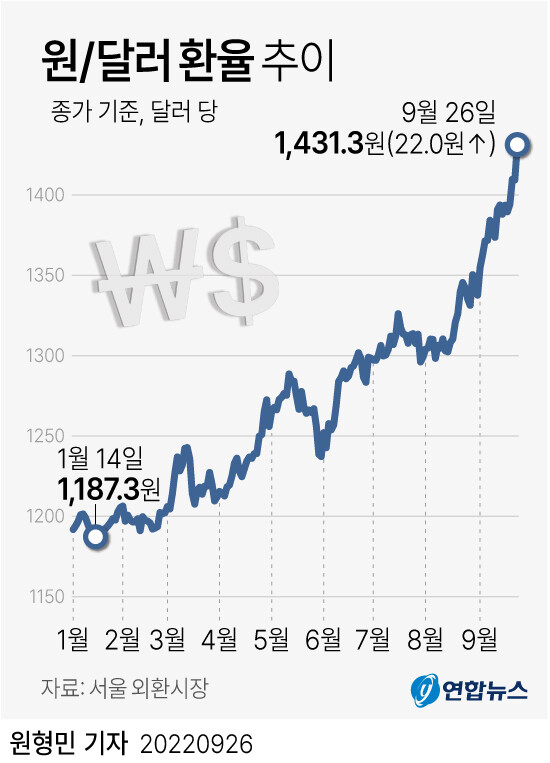 원/달러 환율이 1430원을 웃돈 것은 2009년 3월 17일(고가 기준 1436.0원) 이후 13년 6개월여 만이다.