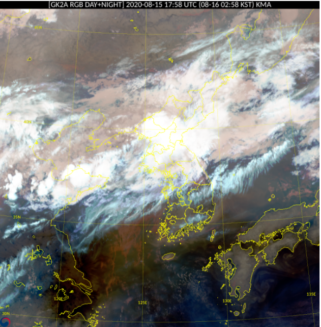 ▲ 16일 새벽 2시58분 현재 한반도 상공의 천리안위성 2A호 영상. [출처= 기상청] |
