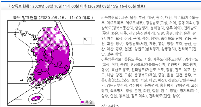 15일 오후 4시 발표된 16일 오전 11시 이후 기상 특보 현황을 보면, 충청권·전라권·경상권·제주권 대부분의 지역에 ‘폭염경보’, 충청권 북부와 경상권 북부를 포함, 서울과 경기도, 강원도 대부분의 지역에는 ‘폭염주의보’가 예고됐다.