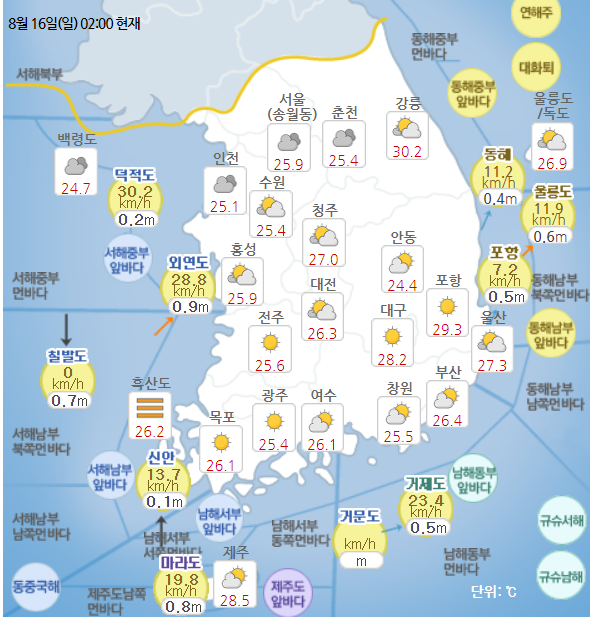새벽 2시 기준 오늘(16일) 전국 주요 도시의 최저·최고 기온을 보면, 서울 25~34도(℃), 인천 24~27도, 수원 24~31도, 백령도 24~24도, 춘천 24~32도, 강릉 27~35도, 청주 24~34도, 대전 23~31도, 전주 25~34도, 광주 25~33도, 목포 26~32도, 여수 25~33도, 안동 24~34도, 대구 25~37도, 포항 26~34도, 울산 24~34도, 부산 25~31도, 창원 24~33도, 울릉도·독도 25~31도, 제주 28~35도로 예상된다.