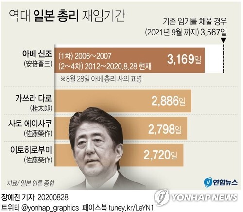 | ▲ 역대 일본 총리 재임기간. [그래픽= 연합뉴스] |