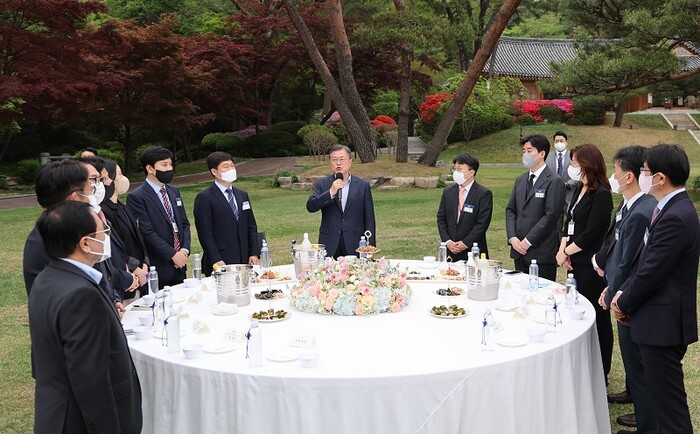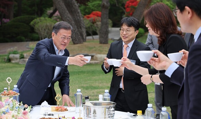 ▲ 문재인 대통령이 25일 오후 청와대 녹지원에서 열린 출입기자 간담회에 참석하고 있다. [청와대 제공] |
