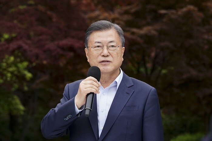 ▲ 문재인 대통령이 25일 오후 청와대 녹지원에서 열린 출입기자 간담회에 인사말을 하고 있다. [서울=연합뉴스] |