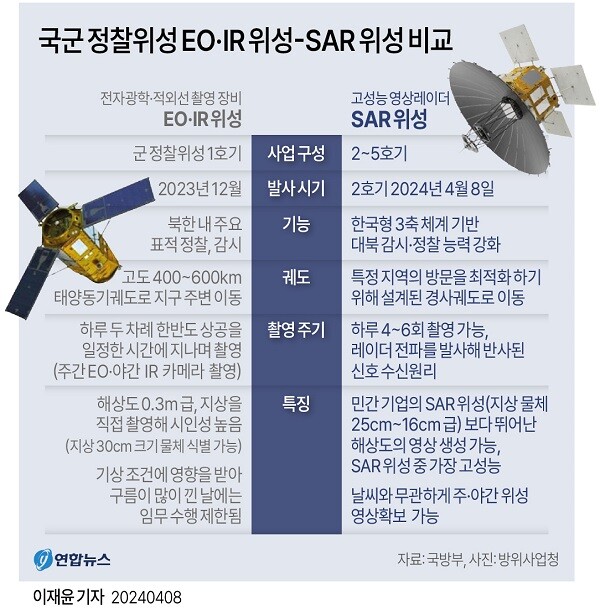 연합뉴스에 따르면, 국방부 관계자는 “EO·IR 위성은 하루에 두 번 한반도를 방문할 수 있지만, SAR 위성은 하루 4∼6회 정도로 2배 이상 자주 방문해 촬영할 수 있다”고 밝혔다.