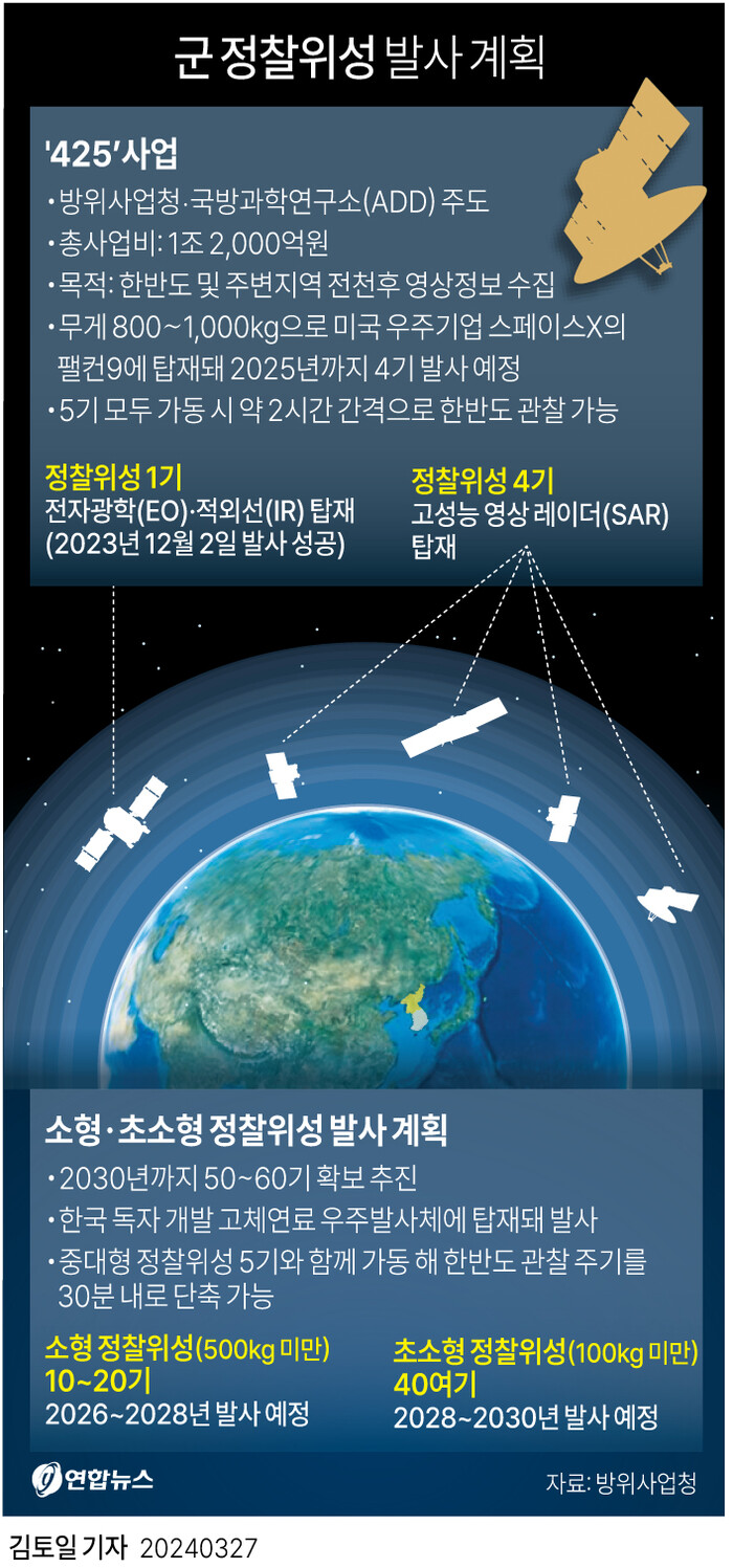 ▲ 군 당국은 '425사업'으로 2025년까지 중대형 정찰위성 5기를 확보한 이후 2030년까지 소형 정찰위성 10∼20기, 초소형 정찰위성 40여기를 발사할 계획이다. [그래픽=연합뉴스] |