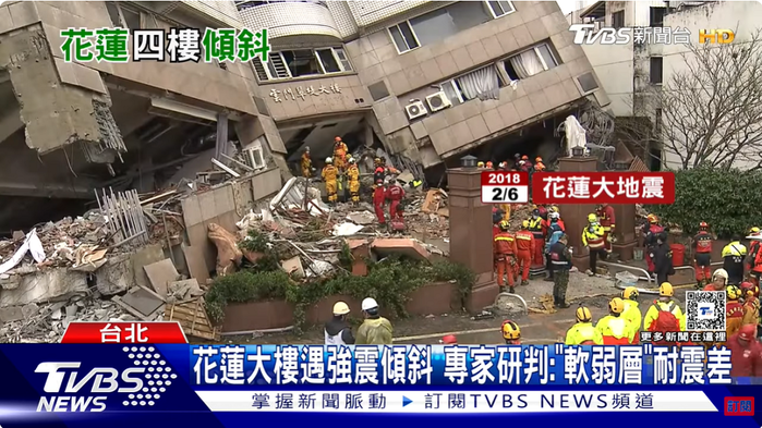 | ▲ 대만 소방관들이 3일 발생한 '화롄 대지진' 피해 현장에서 구조활동을 벌이고 있다. [대만 TVBS 뉴스 유튜브 영상 캡처] |