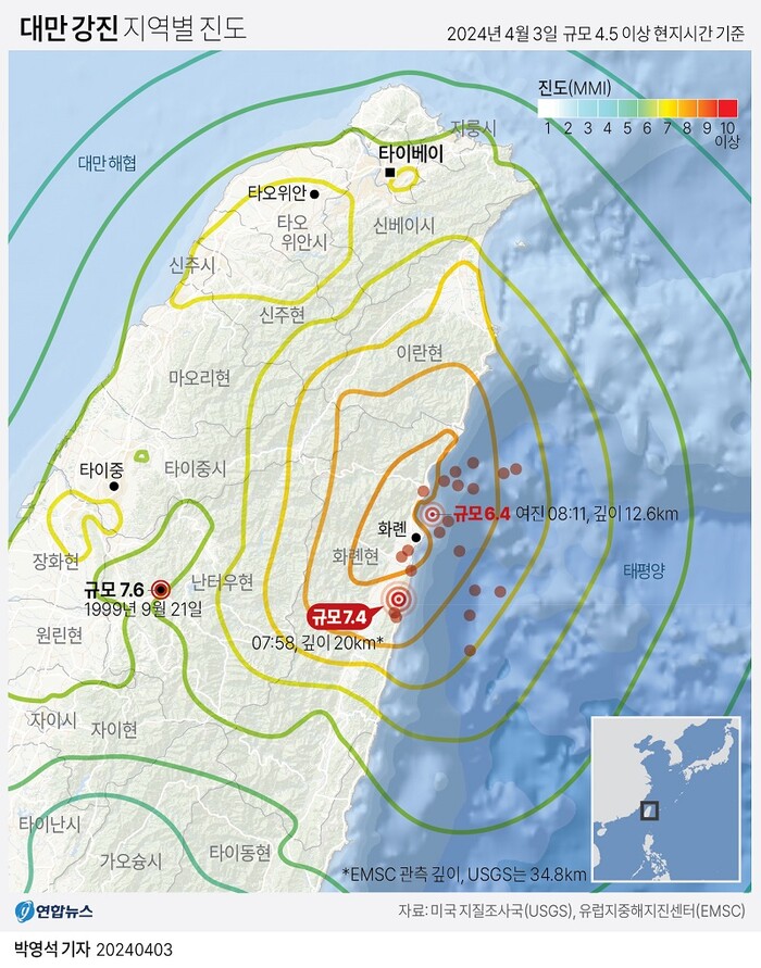 | ▲ 대만 강진 지역별 진도. [그래픽=연합뉴스] |