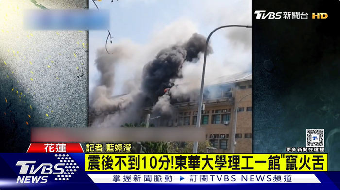 | ▲ 둥화대 이공1관 실험실에서 검은 연기가 뿜어져 나오고 있다. [대만 TVBS 뉴스 유튜브 영상 캡처] |