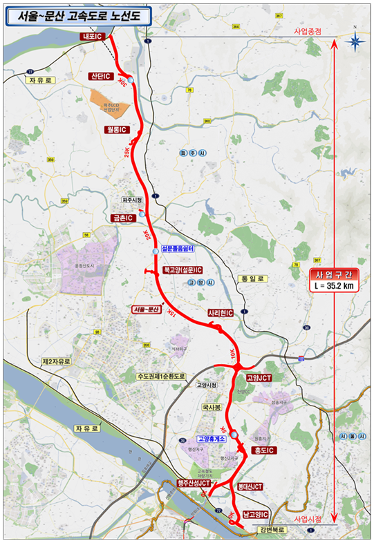 6일 국토교통부에 따르면, 서울~문산 고속도로는 경기 고양시 덕양구 강매동에서 파주시 문산읍 내포리를 연결하는 총 연장 35.2km, 왕복 4~6차로 도로다. 해당 구간을 시속 100㎞가량 정속 주행하면 약 25분이 걸린다고 설명했다.