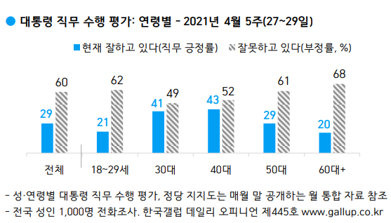▲ 4월 5주째 연령별 대통령 직무 수행 평가. [출처= 한국갤럽조사연구소] |