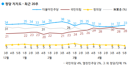 정당 지지도는 민주당이 33%로 전주보다 1%포인트 올랐고, 국민의힘은 전주와 같은 28%로 나타났다. 정의당과 국민의당이 각각 4%, 열린민주당 2%로 그 뒤를 이었다.