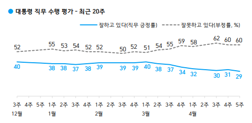 문 대통령이 '잘못하고 있다'(부정률)고 응답한 사람은 전주와 같은 60%를 기록했다. 11%는 의견을 유보했다.