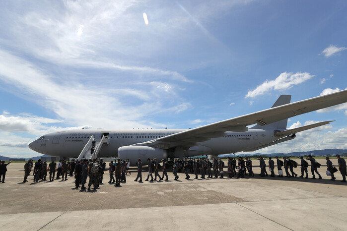 ▲ 18일 공군5공중기동비행단 주기장에 주기 되어 있는 공군 다목적공중급유수송기 시그너스(KC-330)에 청해부대 34진과 대체인력이 사용할 의무 및 각종 물자들을 적재 완료한 후 장병들이 수송기에 탑승하고 있다. [국방부 제공=연합뉴스] |
