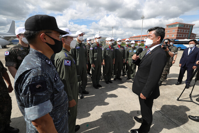 ▲ 서욱 국방부 장관이 18일 청해부대 34진 안전후송을 위해 떠나는 장병들을 격려하고 있다. [국방부 제공=연합뉴스] |