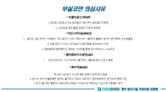그는 “이 중 부실 코인으로 의심되는 것들이 많다”며 “투자자들이 부실 코인이 될 것을 알면 안 되니까 주의를 분산시키려고 한 게 아니냐”며 문제를 제기했다.