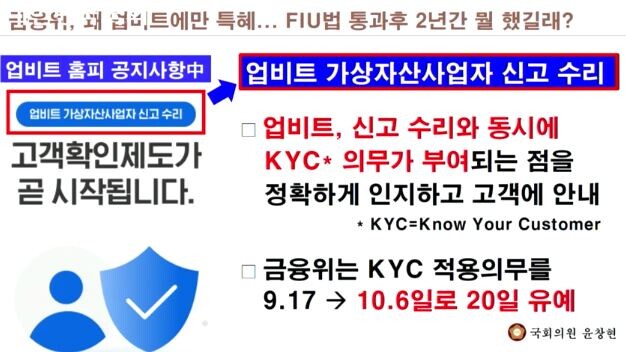 또 윤 의원은 금융위원회 산하 금융정보분석원(FIU)이 지난달 17일 업비트의 가상자산사업자 신고 수리 결정과 동시에 고객확인(KYC) 적용 의무를 이행하게 해야 했지만, 이달 6일까지로 20일이나 유예했다면서 ‘봐주기’ 의혹을 제기했다.