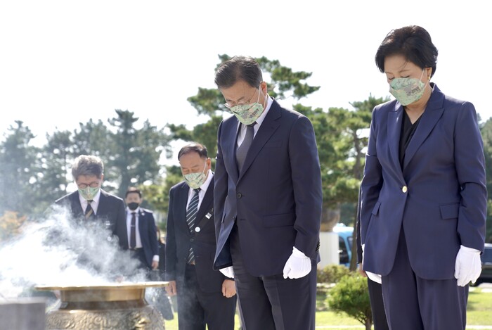▲ 문재인 대통령과 김정숙 여사가 국군의 날인 1일 오전 경북 포항 해병대1사단 부대 내 마린온(MUH-1) 순직자 위령탑에 묵념하고 있다. 문재인 대통령 내외는 제73주년 국군의 날 기념식에 앞서, 지난 2018년 마린온 사고로 순직한 해병대 장병의 희생과 헌신을 기리기 위해 해병대 1사단 내에 건립된 위령탑을 찾아 참배했다. 문 대통령은 "상처를 다시 꺼내는 것이 아닌지 걱정이 된다"면서 유가족에 위로를 전했다. [포항=연합뉴스] |