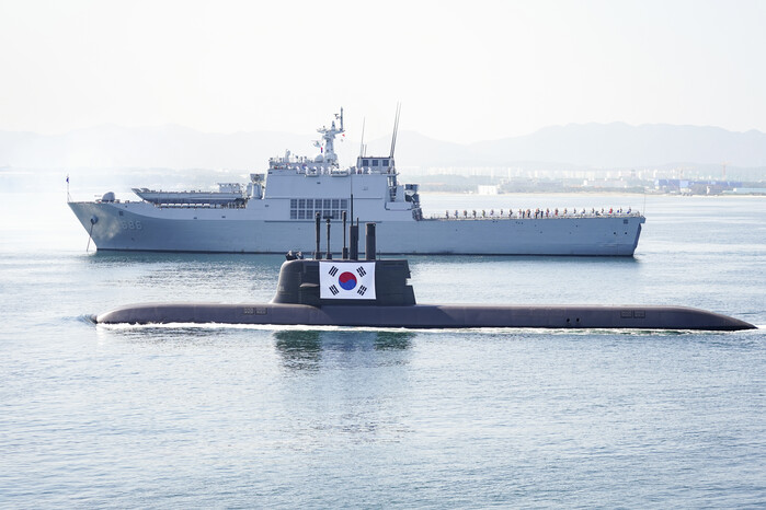 ▲ 1일 경북 포항 영일만 해상 마라도함에서 열린 제73주년 국군의 날 기념식에서 잠수함 도산안창호함이 태극기를 부착한 상태로 수면 위를 항해하고 있다. 뒤쪽은 천왕봉함. [포항=연합뉴스] |