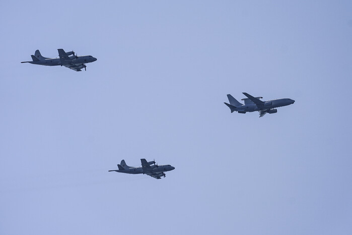 ▲ 1일 경북 포항 영일만 해상 마라도함에서 열린 제73주년 국군의 날 기념식에서 공군·해군 공중전력 시범이 펼쳐지고 있다. ‘피스아이’로 불리는 공군의 E-737 항공통제기.(오른쪽)와 해군의 해상초계기 P-3C. [포항=연합뉴스] |