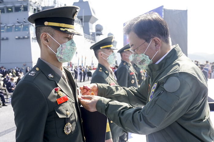 ▲ 문재인 대통령이 1일 경북 포항 영일만 해상 마라도함에서 열린 제73주년 국군의 날 기념식에서 김정수 소령에게 화랑무공훈장을 수여하고 있다. [포항=연합뉴스] |
