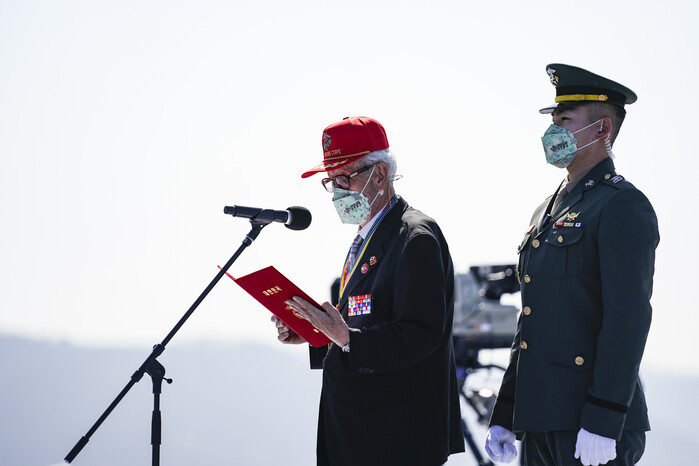 ▲ 제73주년 국군의 날 기념식에서 해병대 1기 이봉식 옹이 국민의례 때 맹세문을 낭독하고 있다. [포항=연합뉴스] |