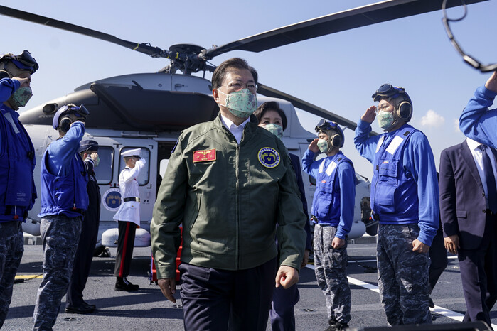 특히, 이날 행사는 이달 작전 배치를 앞둔 해군의 두 번째 대형수송함 마라도함(LPH·1만4천500t급) 함상에 문 대통령이 해병대 상륙기동헬기(마린온) 1호기인 '마린원'(호출부호)을 타고 함에 내리면서 시작됐다. 대통령이 해병대 헬기를 탄 것은 이번이 처음이다.