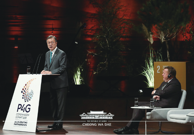 ▲ 문재인 대통령이 2018년 10월 20일(현지시간) 덴마크 코펜하겐 시내 대니쉬 라디오 콘서트홀에서 열린 제1차 P4G 정상회의에서 기조연설을 하고 있다. [출처=청와대 홈페이지] |