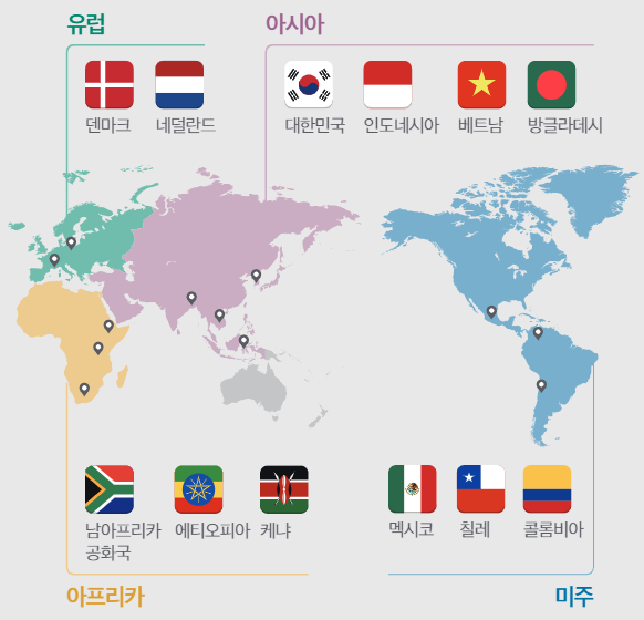 국가의 경우 대륙별로 대표성 있는 12개의 중견국가로 구성돼 있다. 아시아는 대한민국을 비롯, 인도네시아, 베트남, 방글라데시 등 4개국, 유럽은 덴마크와 네덜란드 등 2개국, 아프리카는 남아프리카공화국, 에티오피아, 케냐공화국 등 3개국이다.