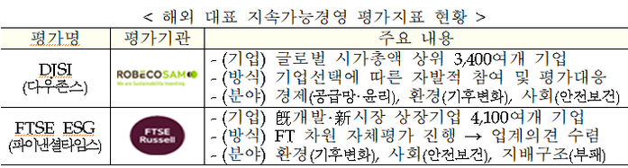 ▲ 해외 대표 지속가능경영 평가지표 현황. [출처= 산업통상자원부] |