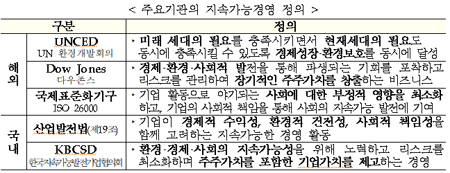 ▲ 주요기관의 지속가능경영 정의. [출처= 산업통상자원부] |