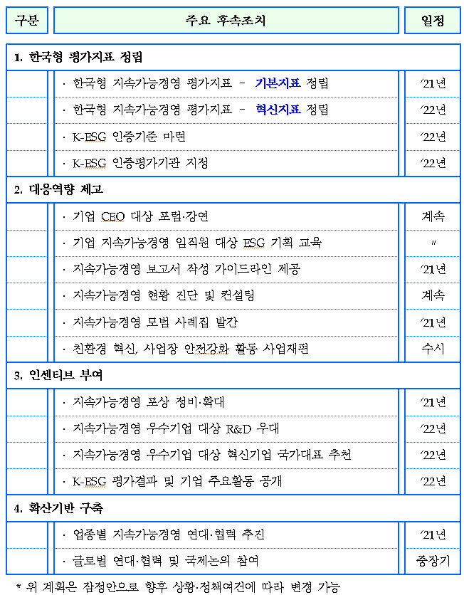 역량 강화를 위해 지속가능경영 사내전문가 육성 등의 교육과, 기업별 역량진단·대응지원 등의 컨설팅을 해주고, 친환경·안전강화형 사업재편을 인정해준다.