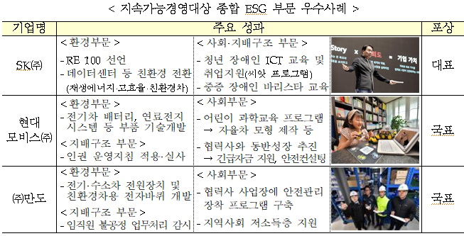 SK㈜는 친환경 오피스 구축(E)과 청년 장애인 일자리 확대(S) 등의 성과를 인정받아 대통령 표창을 받았고, 현대모비스와 만도는 전기·수소차 기술개발(E)과 협력사 지원(S) 등의 성과를 인정받아 국무총리 표창을 수상했다.