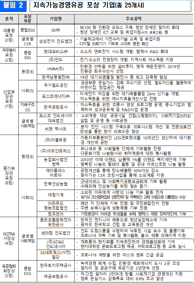 ▲ 지속가능경영 유공 포상 기업 25개사 주요 공적. [출처= 산업통상자원부] |