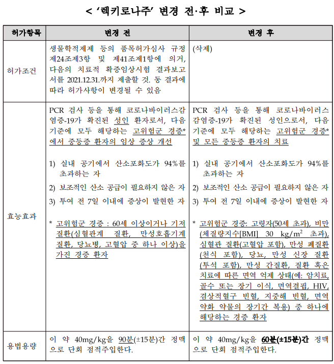 ▲ '국내 1호’ 코로나19 항체치료제 ‘렉키로나주’ 변경 전후 비교. [식품의약품안전처 제공] |