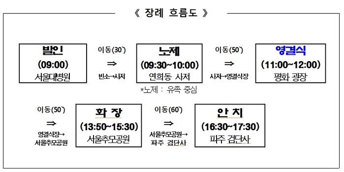 경찰은 빈소인 서울대병원 장례식장부터 임시로 유골이 안치될 파주 검단사까지 시간대별로 교통을 통제할 예정이다.