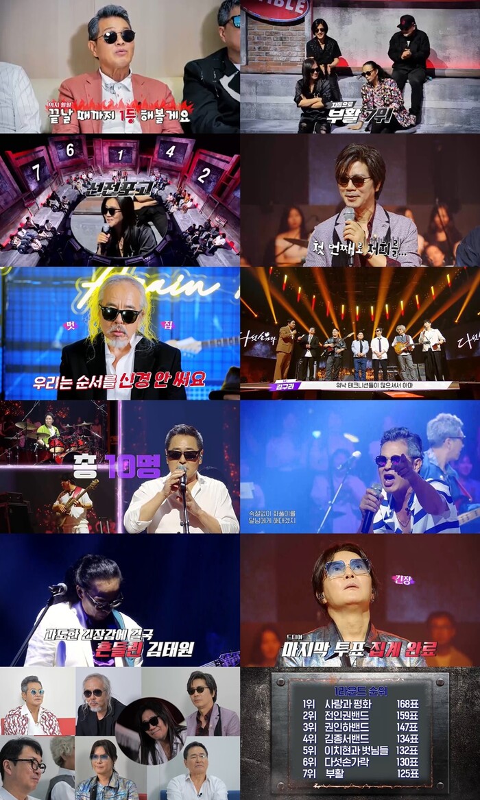 앞서 서로를 탐색하는 ‘평가전’을 가진 7개 팀은 경연 후, 5위 김종서 밴드, 4위 다섯손가락, 3위 전인권밴드 순으로 결과가 발표되자 ‘멘붕’에 빠졌던 터. 이날 김구라와 배성재 2MC는 “사랑과 평화가 1위를 차지했으며, 2위가 이치현과 벗님들”이라고 발표했다. 1위에 오른 사랑과 평화 보컬 이철호는 “제일 오래된 팀이라고 예의를 차려주신 것 같다”고 겸손해 하면서도 “끝까지 1위를 하겠다”고 야심차게 말했다.